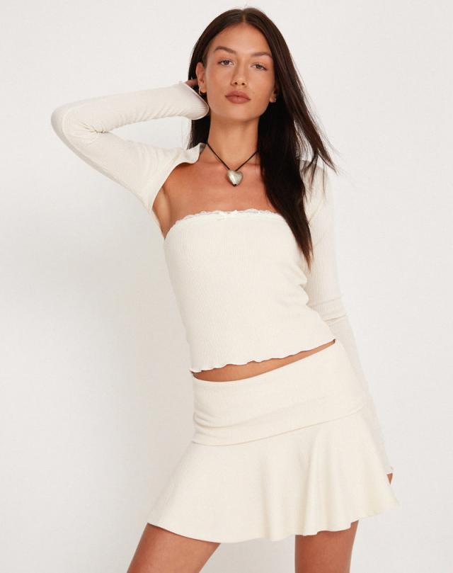 Knitted pleated skirt in ivory, featuring a rib design with low rise and mini fit. For the perfect outfit pair with our Suri Shrug and Ernie Bandeau.MODEL WEARS SIZE: EXTRA SMALL – MODEL HEIGHT:5’7